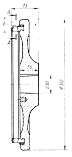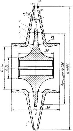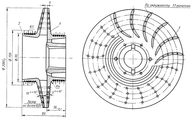 Закрытое рабочее колесо с односторонним выходом газа (рис. 2) состоит из покрывного и лопаточного дисков, соединяемых заклепками. Лопаточный диск может изготовляться фрезерованием, штамповкой или методом точного литья по выплавляемым моделям. Однако, ввиду того, что количество выпускаемых однотипных рабочих колес сравнительно невелико, обычно лопаточные диски выполняются фрезерованием. Оба диска изготовляются из поковок алюминиевого сплава марки АК6. Заклепки, соединяющие диски рабочего колеса, изготовляются из алюминиевого сплава марки В65.
