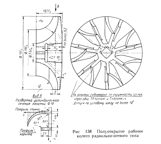< 100 мм) выполняются большей частью в виде полуоткрытых колес радиально-осевого типа с углом установки лопаток на входе, равным 90° (рис. 3).