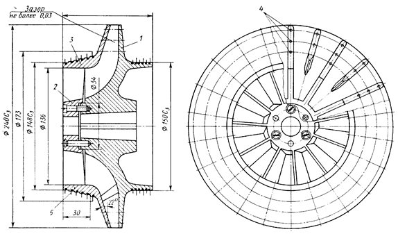 Рис. 4. Закрытое рабочее колесо реактивного турбодетандера радиально-осевого типа: 1 - лопаточный диск; 2 - крыльчатка; 3 - покрывной диск; 4 - заклепки;