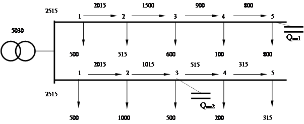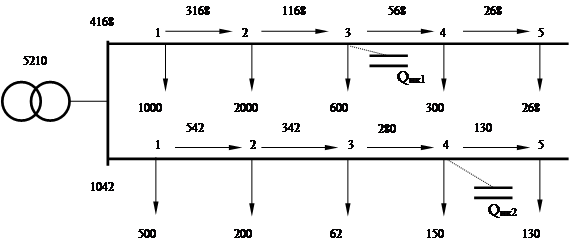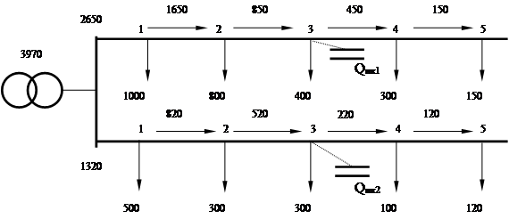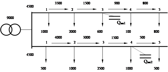 При суммарной реактивной нагрузке трансформаторных подстанций менее 1 МВАр рекомендуется выбирать 1 шинопровод. Если более 1 МВАр - то 2 или 3; число узлов на каждом шинопроводе: 5...7. Реактивная нагрузка вдоль шинопровода распределена неравномерно. Реактивная мощность, поступающая от энергосистемы, в часы максимума нагрузки - Q