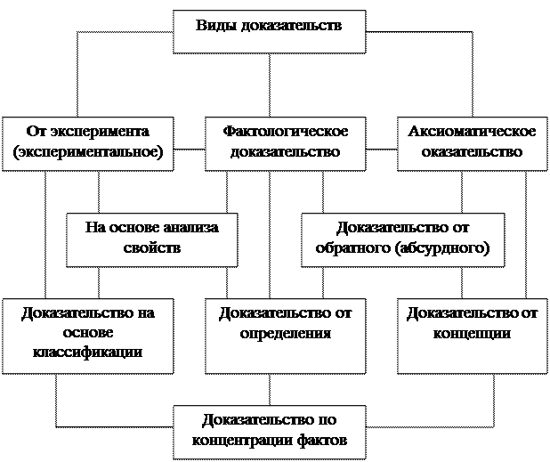 Существуют доказательства фактологические, опирающиеся в основном на фактический материал; формально-логические, главной опорой которых являются законы формальной логики; экспериментальные - построенные на эксперименте; эмпирические - опирающиеся на осмысленный и обобщенный опыт (приложение 5).