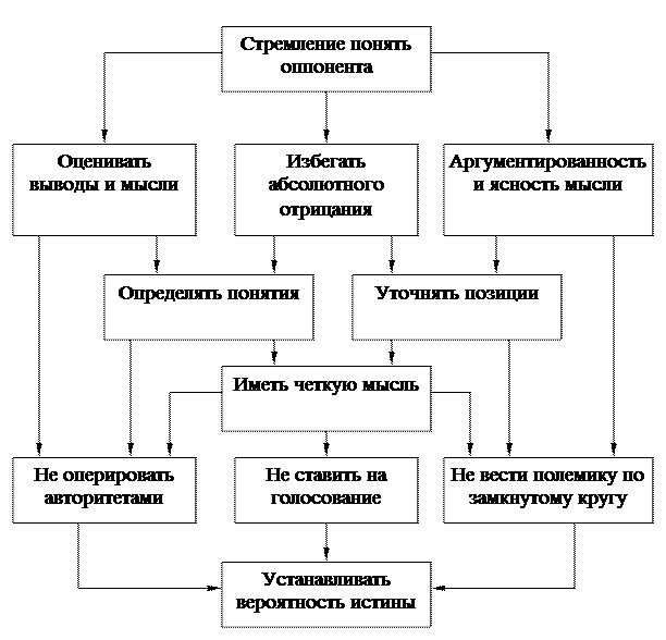 Но эти положительные качества полемики только тогда могут дать эффект исследования, когда она осуществляется по определенным правилам. Ведь можно полемизировать бессистемно, хаотически, бесплодно, преследуя амбиции, а не истину, создавая психологическую напряженность. [4]