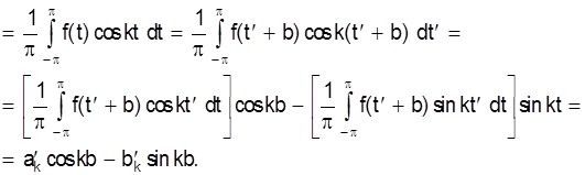 не обладают этими свойствами и меняются при сдвиге оси, то есть когда изменяется начало отсчёта времени. Полагая t=t’+b и используя периодичность f(t), чтобы сдвинуть в интеграле пределы получаем:
