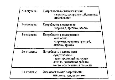 Классифицированные по содержанию мотивы, могут быть подразделены в соответствии с их иерархической структурной моделью на пять классов (ступеней) — так называемая "пирамида потребностей". Потребности первой ступени Маслоу считает врожденными, потребности остальных уровней — приобретенными.