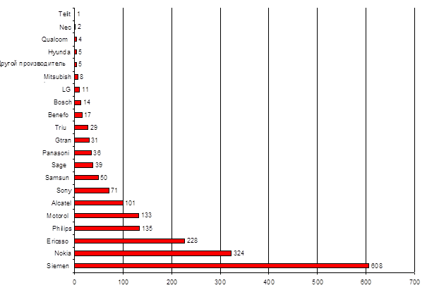 Следующее место по важности при выборе телефонного аппарата для покупателя играет фирма – производитель (марка фирмы). Соответственно спрос на телефоны зависит от сложившегося рейтинга фирм – производителей сотовых телефонов. Уместно привести рейтинг фирм-производителей согласно проведенному интерактивному опросу по состоянию на 12.11.2001: