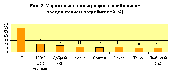 Причем, российские потребители предпочитают в первую очередь апельсиновый, яблочный, томатный и персиковый, абрикосовый соки. Осознавая, что наиболее важными являются качественные характеристики сока, потребители изменили предпочтения по месту покупки этого продукта с рынка на магазины и супермаркеты, подразумевающие гарантию качества продукции.