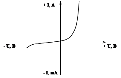 В правой части характеристики дана зависимость прямого тока от напряжения в пропускном (прямом) направлении. В левой части – зависимость обратного тока от напряжения в запирающем (обратном) направлении. Численные значения токов и напряжения изменяются в очень больших пределах в зависимости от свойств полупроводника.