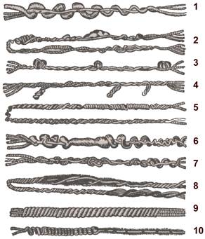 Рис. 2. Виды пряжи фасонной крутки: 1 — спиральная; 2 — узелковая; 3 — петлистая; 4 — с сукрутинами; 5 — застилистая; 6 — комбинированная; 7 — эпонж; 8 — с ровничным эффектом; 9 — с внешней обмоткой; 10 — синель