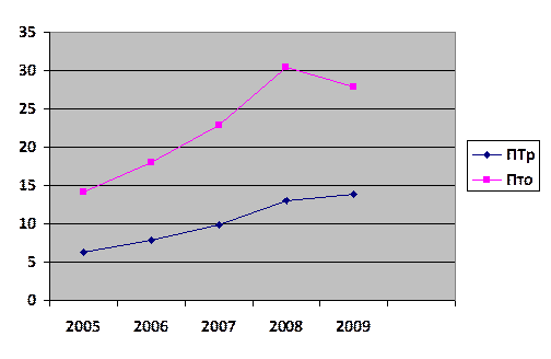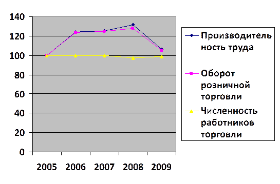 Имея необходимые данные за 2005 – 2009 гг.., а именно розничный и оптовый товарооборот и среднесписочную численность занятых в торговле можно рассчитать производительность труда на одного среднесписочного работника по формуле: