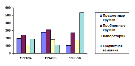 Такое внимание к НИРС во многом обусловлено спадом произошедшим в ней в последние годы. Так, если в 1993/1994 учебном году насчитывалось 17 предметных кружков, в работе которых принимали участие 196 студентов, а в 1994/1995- 29 кружков и 275 работающих в них студентов, то в 1995/1996 годах произошёл заметный спад, и осталось 15 кружков со 104 активными участниками. Аналогичная ситуация наблюдалась и с проблемными кружками: 33 кружка и 312 студентов в 1994/1995 учебном году, 28 и 272 в 1995/1996 учебном году соответственно. Этот факт можно объяснить тем, что реформы, идущие давно и не слишком эффективно, нанесли очередной удар по населению, а именно -невыплата заработной платы из исключения превратилась в хорошо соблюдаемое правительством правило. В связи с этим многие студенты оказались без финансовой поддержки со стороны родителей, и были вынуждены сами зарабатывать средства к существованию, что заняло время, прежде уделяемое НИРС. Не будет большим открытием тот факт, что большинство участников НИРС являются выходцами из семей, где родители также имеют некоторое отношение к образованию и науке, т. е. именно к тем отраслям народного хозяйства, которые находятся на полном бюджетном обеспечении. Именно такие студенты и попали под удар. Студенческие лаборатории оказались более выносливыми, и их количество(7 кафедральных и 1 межкафедральная) осталось неизменным до настоящего времени, а число занятых в них студентов так же значительно не изменилось(185 в 1994/1995 у. г. и 176 в 1995/1996 у. г.). Это подтверждает тезис о том, что в работе лабораторий принимают участие более опытные и увлечённые студенты, которые остаются преданными науке, не взирая на обстоятельства. Однако в некоторых областях научной деятельности студентов наметился явный рост. Например, в работе по бюджетной тематике кафедр в 1993/1994 у. г. приняли участие 189 студентов, в 1994/1995 у. г. -108, а в 1995,1996 у. г. уже 537 студентов. Видимо, студенты ощутили на собственном опыте, что сегодня очень важно разбираться в бюджете нашего государства, и поле для деятельности выглядит бескрайним, потому что бюджетная политика меняется каждые полгода.