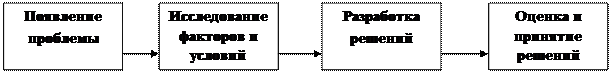 Цель первого этапа — выявление и описание проблемы и проблемной ситуации; второго — поиск возможных вариантов решений. На третьем этапе производится оценка альтернатив и выбор окончательного решения. На последнем этапе целью работ является организация, контроль и оценка результатов выполнения принятого решения.