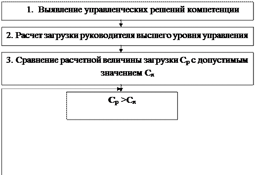 будем понимать такое, при котором каждый руководитель принимает решения, соответствующие его компетенции Для решения этой задачи предлагается методика, в основе которой лежит исследование загрузки руководителей, принимающих управленческие решения. Содержание и последовательность работ, предусмотренных методикой, отражены на рис. 2.