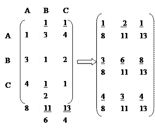 Построим матрицу предпочтений для оценки важности критериев. При этом элементы строки сравниваются с элементами столбца по критериям. При сравнении элемента с самим собой берется ранг, равный единице. При сравнении элементов столбца с элементами строки – обратная величина. Последняя величина в столбце – сумма элементов (расчеты опираются на представление о матрице как о двумерной дискретной случайной величине).