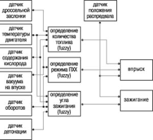 Значение каждого из термов определяют сигналы с датчиков. Теперь, к примеру, ситуация «Двигатель запущен недавно, большая нагрузка, среднее ускорение» можно описать следующей комбинацией термов: {0,9; 0; 0; 1; 0; 0,5}. Принимая значения термов в качестве весовых коэффициентов, отдельные модули рассчитывают сигнал управления для подсистем впрыска, зажигания и принудительного холостого хода.