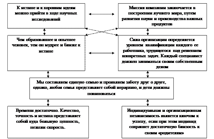 Основополагающим элементом корпоративной культуры являются ее внутренние ценности. К системе внутренних ценностей относятся основные философские положения и идеи, принятые в компании. Американские социологи Томас Питере и Роберт Уотерман, авторы книги «В поисках эффективного управления (Опыт лучших компаний)», на основании изучения таких компаний как IBM, Boeing, Dana, McDonald's, Behtel и др., пришли к выводу, что преуспевающие фирмы отличаются прочной ориентацией на ценности.
