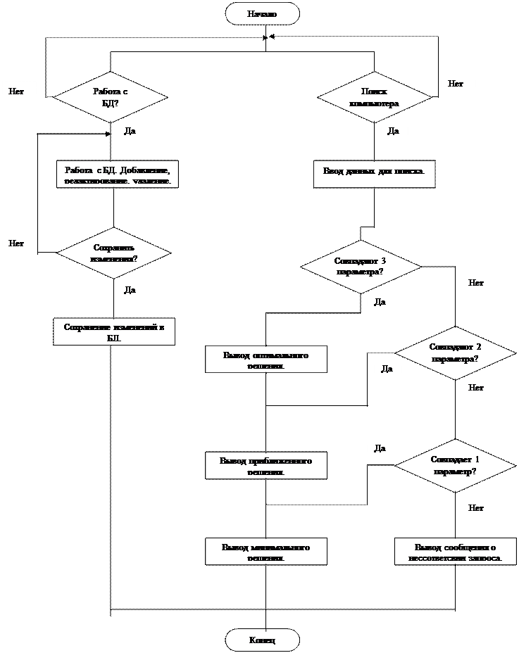 Алгоритм работы программы следующий: при входе в программу мы можем выбрать что будем делать: работать с базой данных, либо создать запрос на поиск компьютера (ноутбука) по имеющемся требованиям. Если выбрана работа с базой данных, то нам доступны стандартные функции работы с базой данных: добавление, редактирование, удаление. Так же мы можем сохранить измененную базу. Если выбрано создание запроса на поиск, то программа предлагает нам выбрать варианты запросов. Затем, если существует, будет выдан оптимальный компьютер, после этого компьютеры, подходящие по двум параметрам и, наконец, компьютеры подходящие только по одному параметру.