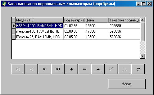 При открытии формы работы с базой данных (рисунок 3), мы видим, представленную в табличной форме, базу по имеющимся в продаже компьютерам (ноутбукам) Стандартные кнопки навигации по базам данных Delphi