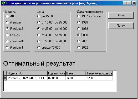 Кнопка “Назад” позволяет вернуться на заглавную форму. Таким образом наша модель позволяет выбирать компьютер (ноутбук) по жестко заданным меркам, но и предоставляет альтернативу.
