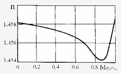 Рис. 8 Зависимость показателя преломления бинарной стеклообразующей системы В2О3 - SiO2 от молярной доли оксида кремния М(SiO2): |