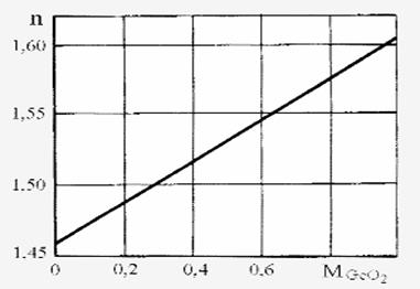 Рис. 9 Зависимость показателя преломления плавленого кварца от молярной доли оксида германия М(GeO2):Из большинства видов стекол самым низким поглощением в видимой области спектра обладает плавленый кварц - при условии высокой степени очистки и гомогенности (однородности по составу). Значительные преимущества кварца обусловлены малыми внутренними потерями на рассеивание. Высокая температура плавления кварца (1610 С при быстром нагреве, 1720 С при медленном), с одной стороны, требует специальной технологии для изготовления оптического волокна, а с другой - помогает избавиться от различных примесей, которые испаряются при более низких температурах. Стекла, применяемые для изготовления световодов (сердцевины и оптической оболочки), различаются показателями преломления n. В кварц (показатель преломления n = 1,4585 на длине волны 0,589 мкм) добавляется оксид бора (n = 1,4585 на длине волны 0,589 мкм), снижающий показатель преломления (рис.8). Полученный материал может быть применен в качестве оболочки оптоволокна. Длительный отжиг (термическая обработка стекла, придающая необходимые свойства) боросиликатного стекла приводит к увеличению n. Этот материал используется для изготовления сердечника. Другой способ понизить показатель преломления плавленого кварца - добавить в него фтор. В отличие от метастабильного характера изменения этого показателя у чистого боросиликата, снижение его у боросиликатного стекла с добавкой фтора - внутреннее свойство атомов фтора в матрице SiO2. Разность показателей преломления чистого SiO2 и материала с добавкой фтора увеличивается линейно с повышением молярной концентрации фтора вплоть до нескольких процентов. Показатель преломления кварца уменьшается на 0,2% при изменении молярной концентрации фтора на 1%. При этом оптические свойства кварца не ухудшаются. Фторирование кварца позволяет уменьшить рассеивание Рэлея и минимизировать волновые потери. Однако легирование фтором увеличивает вероятность возникновения трещин и уменьшает прочность стекла, а, кроме того, делает кварц более чувствительным к диффузии водорода. Все другие добавки к плавленому кварцу - такие, как GeO2 (рис.9), P2O5, TiO2, Al2O3, Sb2O3 приводят к увеличению показателя преломления по сравнению с чистым кварцем без ухудшения его оптических свойств. Молярные доли этих оксидов в кварце могут меняться в пределах от 1 до 15%. Показатель преломления увеличивается на 0,001 при увеличении молярной доли GeO2 на 1%. При 20-процентной молярной концентрации двуокиси германия показатель преломления увеличивается на 1,5%. Кварц с добавкой германия, который может быть использован в качестве материала сердцевины оптоволокна , имеет широкое окно прозрачности почти до 1,7мкм (рис.5). Более предпочтительным в качестве легирующего материала (как более дешевого) является фосфорный ангидрид Р2О5. При добавлении к плавленому кварцу Р2О5 для образования бинарного стекла внутреннее поглощение материала и рэлеевское рассеяние увеличиваются весьма незначительно. Фосфорный ангидрид сублимируется (переходит из твердого состояния в газообразное, минуя жидкое) при температуре 300 С , гигроскопичен (способен поглощать влагу из воздуха) и имеет температурный коэффициент линейного расширения почти в 25 раз больше, чем у плавленого кварца. Однако он образует с кварцем устойчивое бинарное стекло,