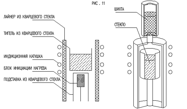 В электрической печи энергия переносится от стенки печи к тиглю посредством теплового излучения. Для применения ВЧ метода используют «матрешку»: платиновый (или кварцевый) тигель помещают для стерильности внутрь кварцевого сосуда (рис.11). Тепло подводится от ВЧ источника энергии с помощью катушки индуктивности, внутри которой помещен кварцевый сосуд.