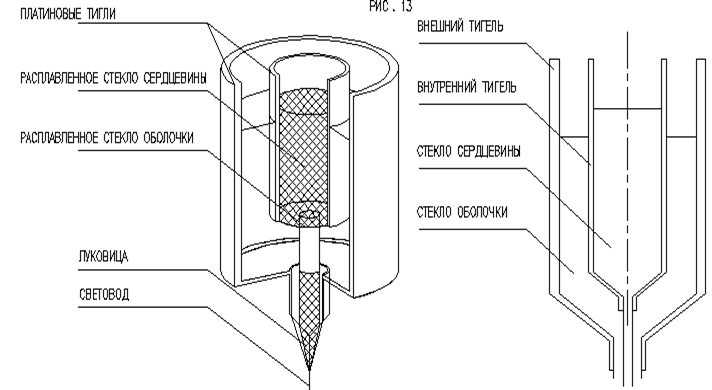 Оптоволоконные жилы вытягиваются из заготовок методом двойного тигля. Установка из двух тиглей (обычно платиновых), расположенных один в другом, имеет соосную схему расположения (рис.13).