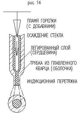 В газовый поток добавляется TiCl4, чтобы получить материал сердцевины, легированный титаном. Этот поток направлялся вниз (рис. 14), внутрь кварцевой трубки, и на внутренней поверхности трубки осаждался слой порошка. Если после этого трубка нагревалась и схлопывалась, то слой легированного кварцевого стекла, осажденный внутри, образовывал легированную сердцевину внутри схлопнутой трубки - внешней оболочки. Из приготовленной таким образом заготовки вытягивался волоконный световод. Недостаток метода связан с тем, что таким методом трудно изготовить световод большого диаметра. Кроме того, титан на стадии вытягивания жилы световода стремится восстановить трёхвалентное состояние, вместо исходного четырёхвалентного. Обладая разной диффузионной способностью, ионы титана могут не дать требуемого профиля показателя преломления. Помешать образованию трёхвалентного титана может отжиг волокна в кислородной атмосфере после вытягивания, делая при этом световод значительно более хрупким. Для устранения возникших проблем вводится модифицированный процесс, сохраняющий стадию пламенного гидролиза без изменений и осаждающий порошок не внутри трубки, а на боковой поверхности цилиндрической подложки из кварцевого стекла. Последовательность осаждения такова: получение нескольких слоёв одинаково легированного кварцевого стекла, в дальнейшем образующего сердцевину. За сердцевиной следуют несколько слоёв чистого кварцевого стекла, образующих оболочку. Образованные таким образом слои затем спекаются в сплошную стеклообразную массу, а цилиндрическая подложка удаляется с помощью высверливания и полировки отверстия, чтобы получить заготовку, которую можно схлопнуть и перетянуть в волоконный световод. При замене TiCl4 на GeCl4 решается проблема ионов титана. Однако, германий летуч и при схлопывании может произойти значительная потеря легирующей добавки из-за испарения. Метод осаждения на циллиндрическую подложку способен обеспечить производство волоконных световодов диаметром 50 мкм, он же позволяет быстро осаждать материал, т.к. скорость осаждения определяется в основном скоростью потока газообразных реагентов через горелку. Метод позволяет производить заготовка со ступенчатым и плавным профилем показателя преломления, к тому же метод хорошо контролируется. Плавность профиля достигается многократным осаждением.