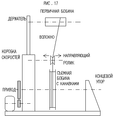 Другой способ вытягивания волокна - применение кабестана (тянущего ролика). Световод в таком случае прижимается вспомогательным роликом к прецизионному колесу тянущего ролика, охватывая его. В таком случае можно осуществить точный контроль скорости вытягивания световода и обеспечить непрерывное вытягивание (даже если в дальнешем наматываются короткие отрезки на разные катушки), исключив остановки и запуски, связанные со сменой катушек и неизбежно вызывающие некоторые колебания размеров вытягиваемого световода при каждом переключении. Используя роликовый приемно-вытяжной механизм, можно связать вытяжную установку непосредственно с экструзионной (выдавливающей) линией для покрытия световода упрочняющим материалом либо электролитической ванной для покрытия слоем металла. Затем можно провести многослойную намотку очень длинных световодов на катушку с фланцами. Пока световод не имеет покрытия, лучше ограничится однослойной намоткой. Изгибы световодов на барабане при многослойной намотке мешают проведению контроля характеристик световода.