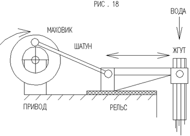 В процессе перемотки с одного барабана на другой при укладке в жгут волокно может оборваться. При этом процесс укладки не следует начинать заново: оторвавшийся конец, находящийся на первичном барабане, вновь укладывается на вторичный барабан и намотка продолжается в том же режиме, что и до обрыва. После того, как жгут будет собран, в нем, очевидно, останутся волокна, один или оба конца которых не лежат на торцах жгута. Подобные волокна не участвуют в переносе изображения – светящейся точке на входе будет соответствовать темная точка отсутствующего волокна на выходе. Для избавления от лишних волокон жгут необходимо подвергнуть внешнему воздействию, которое удалит лишние волокна, - вибрации на установке показанной на рис.18 (аналог шатуна паровоза). Один торец жгута зажимается в струбцине и жгут некоторое время подвергается колебанию. С незафиксированного конца выходят оборванные в процессе намотки волокна, которые без труда удаляются. Затем жгут переворачивают и закрепляют другой стороной. Для перевернутого жгута процесс повторяется. Чтобы повысить эффективность установки следует на закрепленный конец подавать воду. Вода окажет дополнительное выталкивающее воздействие и, к тому же, будет способствовать выскальзыванию световодов.
