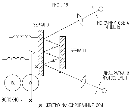 Для измерения диаметра отдельных волокон нельзя применять механические методы из-за малости диаметра волокон (25-50-100 мкм, возможно меньше). Наилучший результат, т.е. максимальную точность измерений, дают только оптические методы. Измерение диаметра проводится путём оптического контроля расстояния между двумя точными роликами, сжимаемыми пружиной, при прохождении между ними волокна. В данном случае используются оптические методы увеличения механических перемещений. Повешение чувствительности достигается путём применения двух параллельных зеркал, одно из которых присоединено к механическому рычагу ролика с пружиной. Изображение источника света после многократных отражений от зеркал проецируется на экран или фотоэлемент (рис.19). Высокая чувствительность достигается за счет сложения механического и оптического усиления. Точность данного метода ограничена механическими перемещениями, вибрациями, дефектами поверхности роликов. Для измерения диаметра волокна можно так же использовать микропроектор. В таком случае волокно проходит через тщательно стабилизированные ролики, а изображение волокна увеличивается микропроектором. Диаметр волокна может измеряться непрерывно, но возможно так же измерение диаметра волокна через случайные (но достаточно короткие) интервалы времени. Использование фотоэлемента позволяет получить электрические сигналы, связанные с изменением диаметра волокна. В данном случае фотоэлемент осуществляет обратную связь в системе контроля.