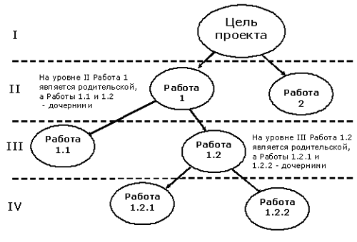 Для управления проектом его следует разбить на иерархические подсистемы и компоненты. В терминах управления проектами структура проекта представляет собой "дерево" ориентированных на продукт проекта компонентов, представленных оборудованием, работами, услугами и информацией, полученными в ходе реализации проекта. Можно сказать, что структура проекта – это организация связей и отношений между его элементами. Формирование структуры проекта позволяет представить его в виде значительно меньших блоков работ вплоть до получения самых мелких, поддающихся непосредственному контролю позиций. Именно такие блоки передаются под управление отдельным специалистам, ответственным за достижение конкретной цели достигаемой при реализации задач данного блока.
