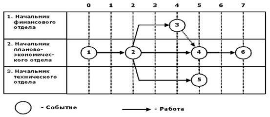 Она совмещается с календарно-масштабной сеткой времени, которая имеет горизонтальные и вертикальные «коридоры»: горизонтальные «коридоры» характеризуют ступень управления, структурное подразделение или должностное лицо, выполняющие ту или иную работу; вертикальные — этап и отдельные операции процесса управления проектом, протекающие во времени (Приложение 1).