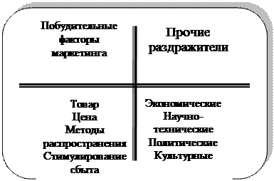 Анализ новейших публикаций зарубежных авторов свидетельствует о том, что ими используется в основном условная модель процесса принятия решения покупателем, предложенная Ф. Котлером, представленная на рис. 1. На нем показано, что побудительные факторы маркетинга и прочие раздражители проникают в "черный ящик" сознания покупателя и вызывают определенные Отклики.