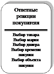 Пройдя через "черный ящик" сознания покупателя, все эти раздражители вызывают ряд поддающихся наблюдению покупательских реакций, представленных в правом прямоугольнике: выбор товара, выбор марки, выбор дилера, выбор времени покупки, выбор объема покупки.