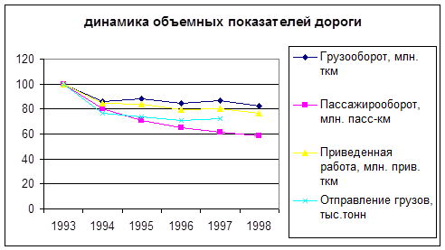 В последние годы на дороге происходит падение объемов работы, о чем говорят данные табл.2.2. Падение же объемов работы приводит к увеличению себестоимости транспортной продукции, что находит отражение в увеличении тарифов. А это в свою очередь стимулирует дальнейшее сокращение перевозок.