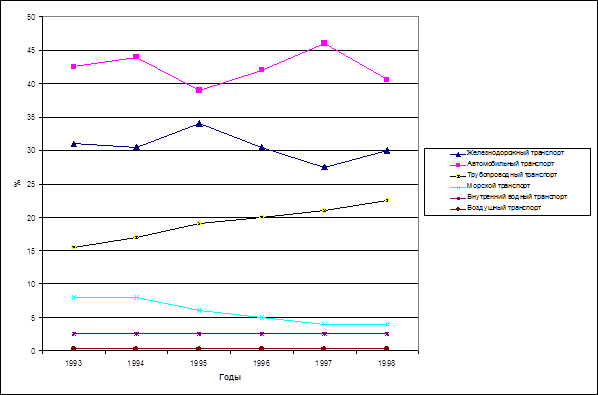 Структурная перестройка российской экономики, изменение масштабов и географии экономических связей России существенно откорректировали межотраслевые и межрегиональные связи для всех субъектов рынка. Резко сократился уровень промышленного производства. Значительно сократился также торговый оборот России с государствами СНГ. Снизились реальные доходы населения, что привело к сокращению его подвижности. Эти обстоятельства предопределили сокращение объемов перевозок грузов и пассажиров, которые снизились за последние пять лет на 53% и 48% соответственно.