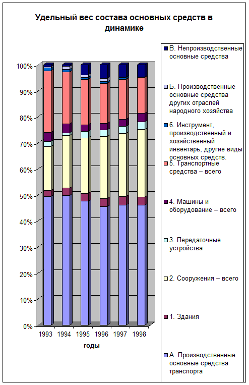 Расчеты показывают, что степень износа действующих основных фондов постоянно растет и а настоящее время составляет свыше 45% против 33% в 1993 году. Коэффициент обновления сильно сокращается только в 1998 году упал с 11% до 3%, а ведь в 1993 году он составлял 23%. Это связано с тем, что количество вводимых основных фондов сравнялось с количеством списываемых, а в 1998 году количество выбывших основных фондов превысило количество введенных в эксплуатацию. Из-за этого происходит старение используемых основных средств и следствием этого становиться отставание от научно-технического прогресса.