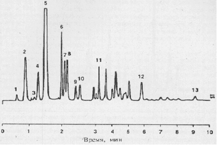 Для начала немного теории. Газовая хроматография - это метод определения качественного и количественного состава вещества, основанный на разделении пробы на составляющие компоненты. При этом ГХ в отличии от других методов анализа вещества (масс-спектрография, рентгенография, инфракрасная спектроскопия и др.) обладает таким отрицательным качеством как деструктивность вводимой пробы. Hо благодаря этому фактору данный метод позволяет производить анализ вещества, состоящего из трудноразделяемых компонентов. В ГХ разделение вещества происходит при нагревании пробы в течение определенного времени, при этом разделение пробы на индивидуальные компоненты достигается в соответствии с удерживанием каждого компонента хроматографической колонкой. Время, необходимое для элюирования компонента из колонки определяет так называемое время удерживания, которое для всех компонентов анализируемого вещества разное, в результате чего становится возможным проведение качественного анализа. Выход вещества определяется детектором, который генерирует изменение тока или напряжения пропорционально количеству выхода. В ГХ каждому выходу соответствует свой пик (рис. 1).