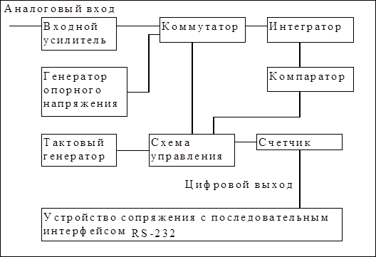В силу того, что данный АЦП применяется в условиях сильных электромагнитных помех, было решено остановиться на схеме АЦП двойного интегрирования, который эффективно "фильтрует" короткие выбросы напряжения. Для этой же цели частота дискретизации входного сигнала была выбрана пропорциональной частоте тока в электрической сети - 25 Гц. Hа этой частоте удается с достаточно большим избытком получать информацию с выхода хроматографа.[1]