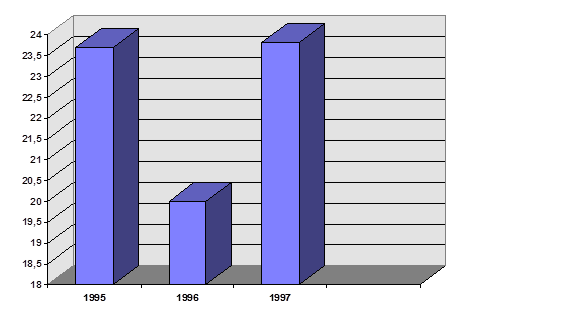 В 1995 году в России по оценкам экспертов было продано около 1 млн. персональных компьютеров, что практически равно количеству машин проданных в 1994 году. Правда существуют и иные оценки, и потому считают что на компьютерном рынке России в 1995 году имел место значительный прирост: на 23,7% (Рис. 1) в единицах персональных компьютеров различного типа и на 35,8% в ценовом измерении. (Рис. 2).