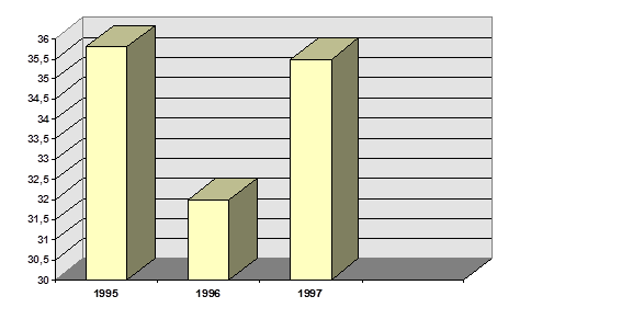 Российский рынок ПК в 1996 году вырос на 20% по количеству проданных единиц. По подсчетам в течение года была осуществлена поставка 1, 050,000 компьютеров. Объем российского рынка ПК в денежном выражении вырос на 32 % в 1996 году и составил 1.486 миллиарда долларов. При этом темпы роста объемов продаж упали за последние два-три года с 50-60 до 20- 25% и в ближайшее время, по-видимому, стабилизируются примерно на общемировом уровне (15 - 20%). Причем, если проследить динамику, то мы получим следующие цифры: Объемы рынка ПК: