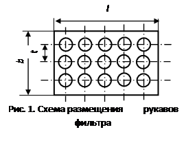 в пределах от 900 до 1200 Па. Из (2) находят площадь фильтрации рукавов. Затем задаются диаметром рукава (120-140 мм) и длиной. Находят поверхность одного рукава, а затем – количество рукавов. Предлагается схема размещения рукавов (рис. 1). При этом размер b