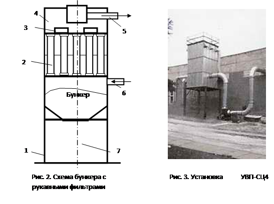 Схема бункера с блоком рукавных фильтров показана на рис. 2. На стойках 1 смонтирован бункер для временного хранения древесных частиц, блок тканевых рукавов 2, вибраторы 3, камера для очищенного воздуха 4, патрубок для подачи очищенного воздуха в цех 5 и патрубок 6 для подачи запыленного воздуха в бункер. При такой схеме установки разгрузка бункера производится при выключенных вентиляторах. Самосвал ставится под погрузку в пространство 7. Общий вид установки показан на рис. 3.