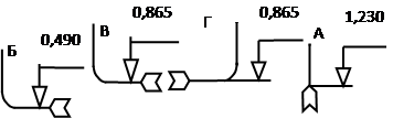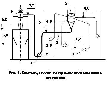 Для наглядности без масштаба вычерчивают расчетную схему кустовой трубопроводной сети с указанием высотных отметок отсосов 1 (рис. 4), ответвлений, коллектора 2, магистрального всасывающего трубопровода 3, вентилятора 4, магистрального нагнетательного трубопровода 5 и приемного патрубка циклона 6.