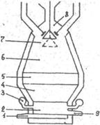 + Q, и образуется сплав железа с углеродом. С повышением содержания углерода (1,8–2%) температура плавления понижается до 1200-150°С. Стекая каплями в горн, расплав смывает куски раскаленного кокса и дополнительно науглероживается. При отекании сплава в горн в нем растворяются восстановленные Мn, Si, образуя сложный железоуглеродистый сплав - чугун (3,7-4% С). Его конечный состав устанавливается в горне и зависит от состава, свойства и количества шлака. Закись марганца MnO восстанавливается только прямым путем - твердым углеродом при 1100°С по реакции: МnО + С=Мn+СО-Q. Восстановление кремния из SiO3