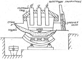 Печь питается трехфазный переменный током и имеет три цилиндрических электрода из графитизированной массы. Между электродами и металлической шихтой под действием тока возникает электрическая дуга, электроэнергия превращается в теплоту, которая передается металлу и шлаку излучением. Рабочее напряжение 160-600 В, сила тока 1-1О кА. Во время работы печи длина дуги регулируется автоматически, путем перемещения электродов. Стальной кожух печи футерован огнеупорным кирпичом.