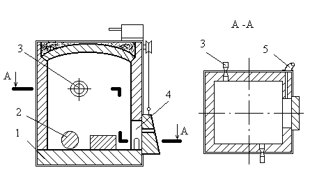 Наиболее распространенным типом печей является камерная печь, в которой заготовки 2 укладывают на под 1 печи через окно 4 и после прогрева до заданной температуры извлекают через то же окно. Рабочее пространство печи нагревают сжиганием газа с помощью горелок 3, служащих для смешения газа с воздухом и подачи смеси в печь. Продукты сгорания отводят через дымоход 5 в рекуператор – теплообменник, в котором поступающий к горелкам воздух нагревается теплотой горячих уходящих газов. Подогрев воздуха до температуры 350 – 500 о