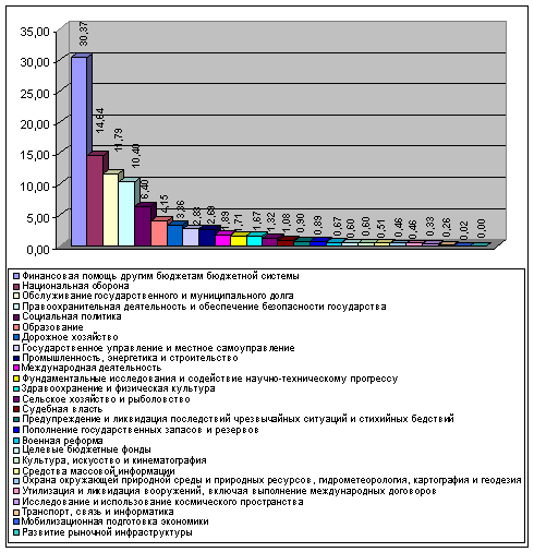 Бюджетная система Российской Федерации, которой все еще присущи масса проблем и негативных черт, находится в настоящий момент в стадии трансформации, то есть – смены ценностного ядра системы. Это долгий и тяжелый процесс, который, учитывая масштабы предстоящих преобразований, скоре всего займет несколько десятилетий. Поэтому структура распределения финансов в федеральном бюджете нестабильная. От общего состояния внешнеэкономической ситуации в мире, мировой экономики, политики государства и зависит распределение расходов в федеральном бюджете нашего государства, т. е. что на сегодняшний год важнее для государства с учетом политики и предстоящих реформ, на то и распределяется большее количество финансов, а что может подождать, то остается на потом.