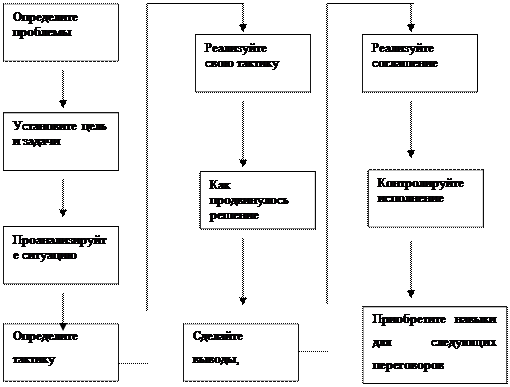 Переговоры состоят из трех основных частей (фаз): подготовка переговоров, процесс переговоров и анализ результатов. Трехфазная модель переговоров показана на схеме.