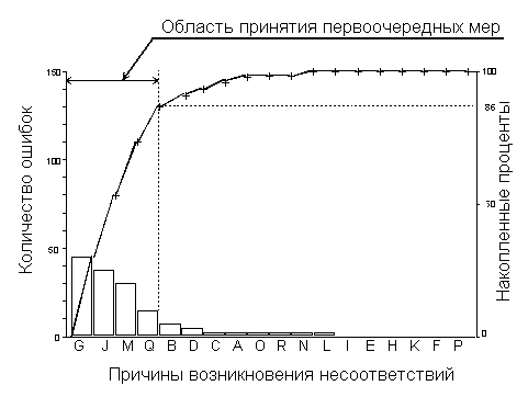 На диаграмме отчетливо видна область принятия первоочередных мер, очерчивающая те причины, которые вызывают наибольшее количество ошибок. Таким образом, в первую очередь, предупредительные мероприятия должны быть направлены на решение проблем именно этих проблем.